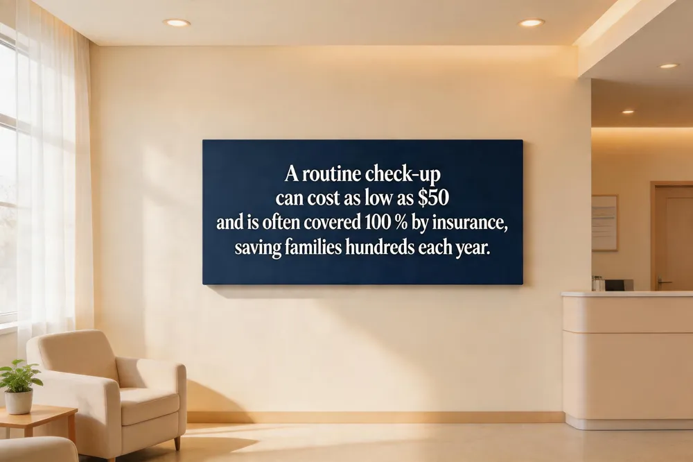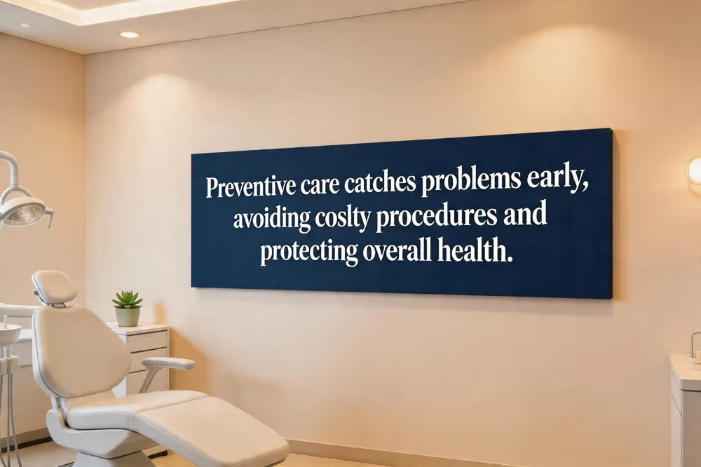Regular dental check‑ups are the cornerstone of a healthy smile and a smart financial strategy for families. Preventive services include oral exams every six months, professional cleanings, digital X‑rays, fluoride treatments, sealants for molars, oral cancer screenings, gum‑health assessments, space maintainers for children, and personalized oral‑hygiene education. By catching cavities, early‑stage gum disease, or oral cancer at their most treatable phases, patients avoid costly restorative work such as root canals, crowns, or periodontal surgery. Early detection also lowers the risk of systemic conditions like heart disease and diabetes, keeping patients pain‑free and confident. Most dental insurance plans cover these preventive services at 100 %—with no deductible, copay, or annual‑maximum impact—making routine exams, cleanings, X‑rays, fluoride, and sealants essentially free at the point of care. The typical cost of a dental check‑up (exam, cleaning, X‑rays) is about $200 nationwide, ranging from $50 to $350, but insurance and discount plans often eliminate out‑of‑pocket expenses. In short, the key benefit of preventive care is early detection and simple, less invasive treatment, which saves money, time, and discomfort for every family.