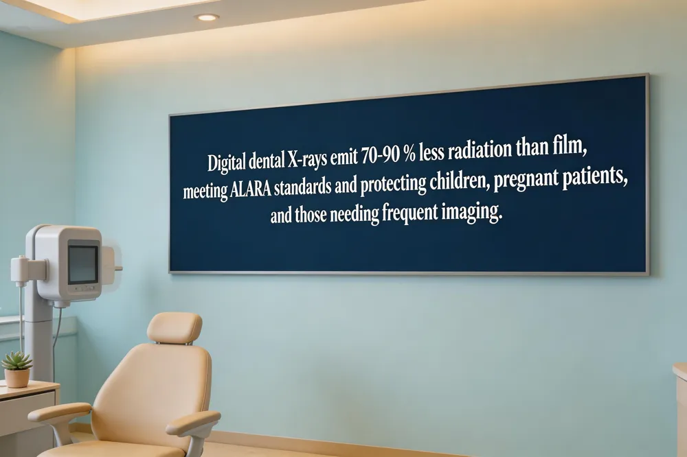 Digital radiography offers lower radiation dose (up to 80‑90 % less), instant images, adjustable contrast, zoom, and Electronic storage, which speeds diagnosis, reduces chemical waste, and lets us show you the picture in real time. The wide dynamic range decreases repeat exposures and helps detect early decay, bone loss, and hidden infections. However, the technology requires a significant upfront investment in sensors, software, and ongoing maintenance, which can raise fees. Intra‑oral sensors are bulkier than film and may trigger gag reflex in sensitive patients, and fragile sensors need careful handling. Unnecessary X‑rays, even with low dose, add cumulative radiation exposure, can produce false‑positive findings, and increase cost without therapeutic benefit—especially for children, pregnant patients, and those needing frequent imaging. Therefore, we reserve radiographs for situations where the image will directly influence treatment planning. Looking ahead, AI‑assisted analysis and dose‑monitoring software promise even safer, more accurate imaging, but responsible use will always require clinical judgment, proper training, and adherence to ALARA principles for every family patient.
