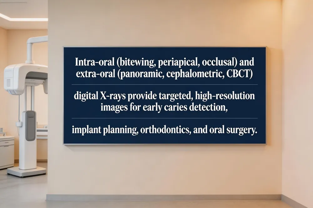Extra‑oral options expand the field of view: panoramic X‑rays give a full‑mouth overview for detecting impacted teeth, jaw fractures, and sinus involvement; cephalometric radiographs support orthodontic treatment planning by mapping skeletal relationships; and cone‑beam computed tomography (CBCT) delivers 3‑D volumetric data for precise implant placement, complex root‑canal mapping, and oral‑surgery navigation.